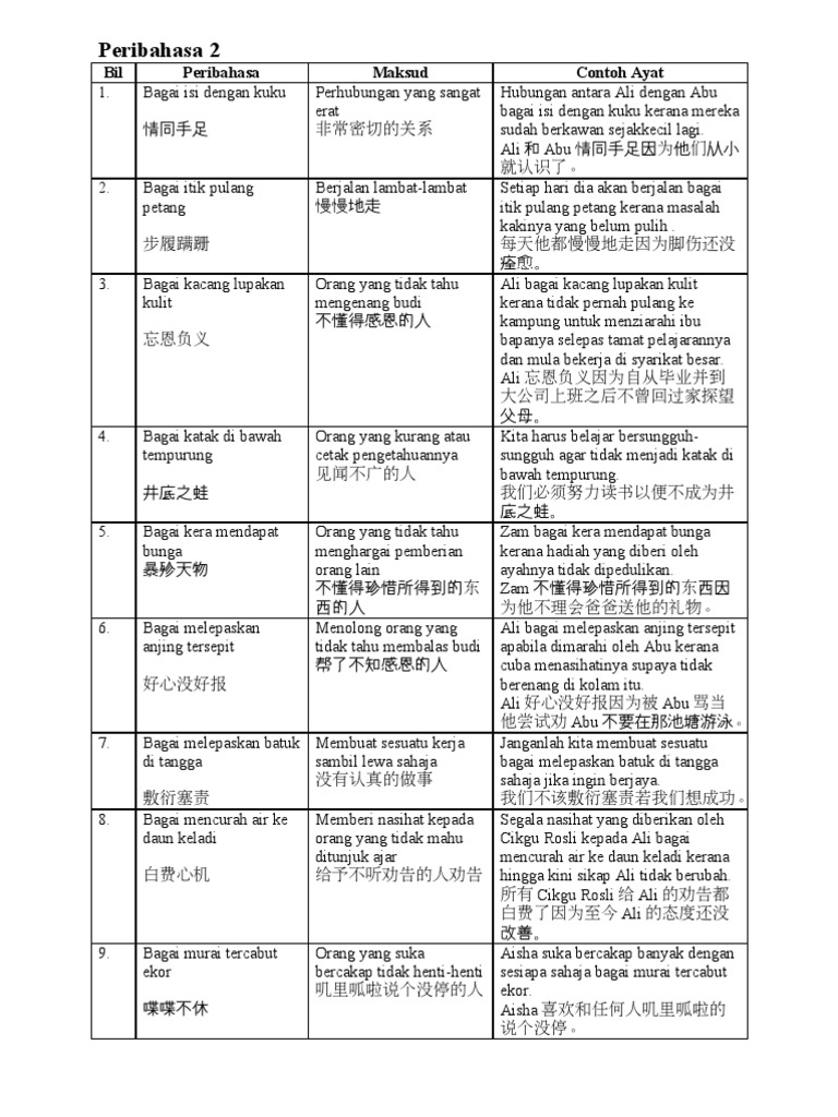 Peribahasa atau pepatah Melayu ni bukan sahaja penting untuk Bahasa Melayu kertas 1 dalam karangan tapi penting juga untuk bahasa Melayu kertas 2 sebab peribahasa sahaja memegang 6 markah yang menentukan anda dapat. Bagai pahat dengan tukul. Bagai aur dengan tebingSaling bekerjasamahidup bantu-membantu.